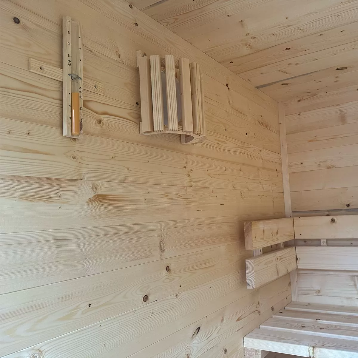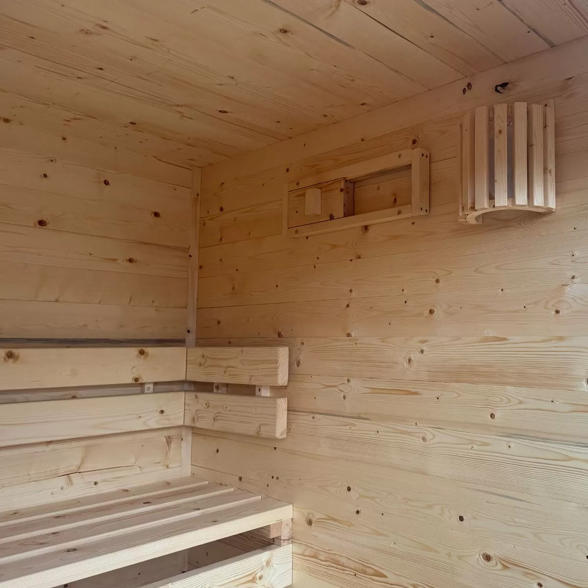 - Băncile interioare sunt fabricate tot din lemn de brad, oferind o suprafață confortabilă și durabilă pentru ședințele de saună. Dispunerea pe două nivele permite utilizatorilor să aleagă locul în funcție de intensitatea căldurii dorite.