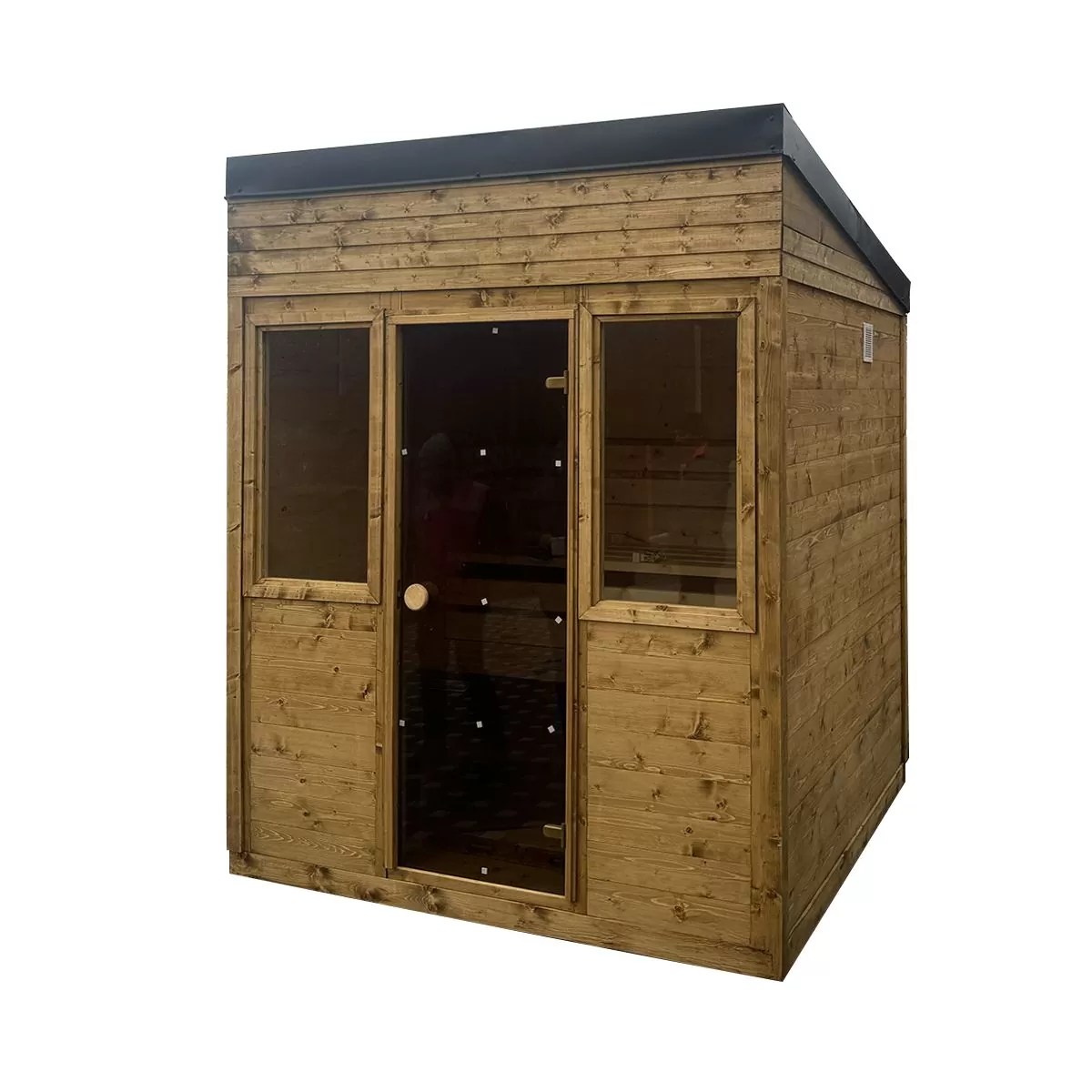 - Design robust și rezistent: Sauna are o înălțime utilizabilă de 220 cm, cu un supliment de 30 cm pentru a crea o pantă eficientă, protejând structura de zăpadă și precipitații.
